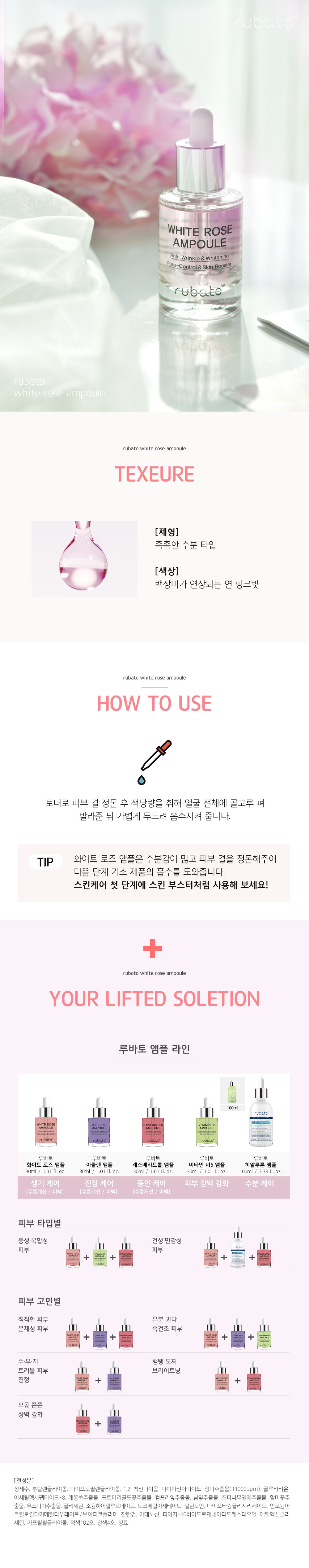 정제수, 부틸렌글라이콜, 다이프로필렌글라이콜, 1,2-헥산다이올, 나이아신아마이드, 장미추출물(11000ppm), 글루타티온, 아세틸헥사펩타이드-8, 개똥쑥추출물, 포트마리골드꽃추출물, 컴프리잎추출물, 님잎추출물, 초피나무열매추출물, 할미꽃추출물, 우스니아추출물, 글리세린, 소듐하이알루로네이트, 토코페릴, 아세테이트, 알란토인, 다이포타슘글리시리제이트, 암모늄아크릴로일다이메틸타우레이트/브이피코폴리머, 잔탄검, 아데노신, 피이지-60하이드로제네이티드캐스터오일, 에틸헥실글리세린, 카프릴릴글라이콜, 적색102호, 황색4호, 향료